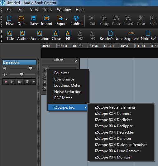 Within HABC, in the left sidebar under the blue "Narration" labeled bar there is the little equalizer symbol that opens up the various built-in effect plugins that Hindy has.